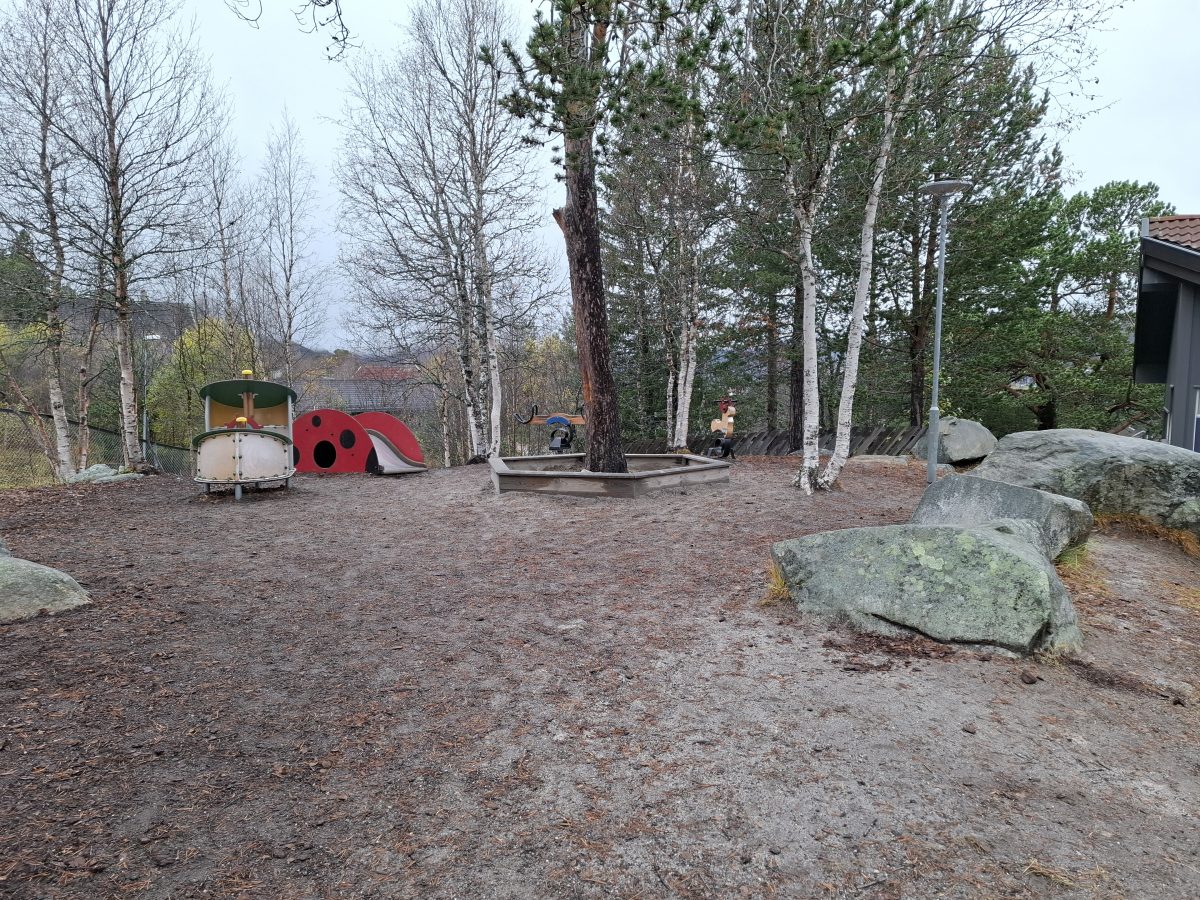 Naturlige elementer som trær, busker, steiner og terrengvariasjoner bør integreres og bevares. Dette gir skygge, skaper rom, inviterer til utforskning og støtter motorisk utvikling.