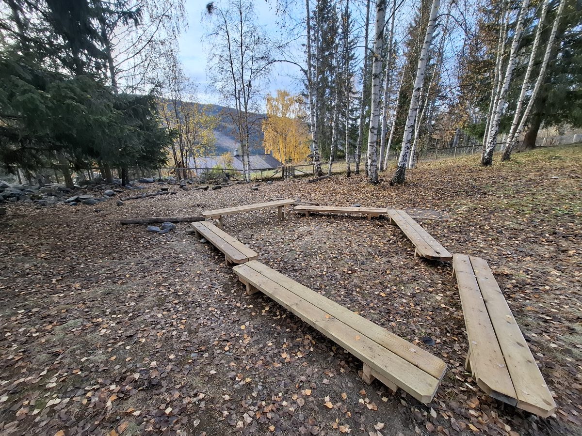 - Sosiale møteplasser: Amfi, sittegrupper, bålplass.