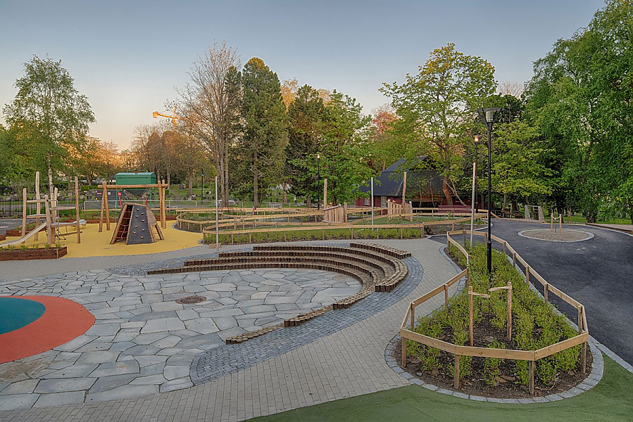 - Rolige soner: Områder for sosialt samvær, hvile eller for å trekke seg tilbake, gjerne skjermet med vegetasjon eller møblering
